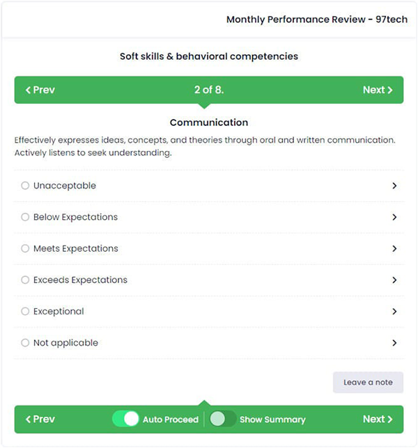 The challenge was two-fold: providing an effective platform for managers to review their teams and devising a comprehensive yet straightforward employee performance evaluation process that could fit the changing roles of team members for each project.